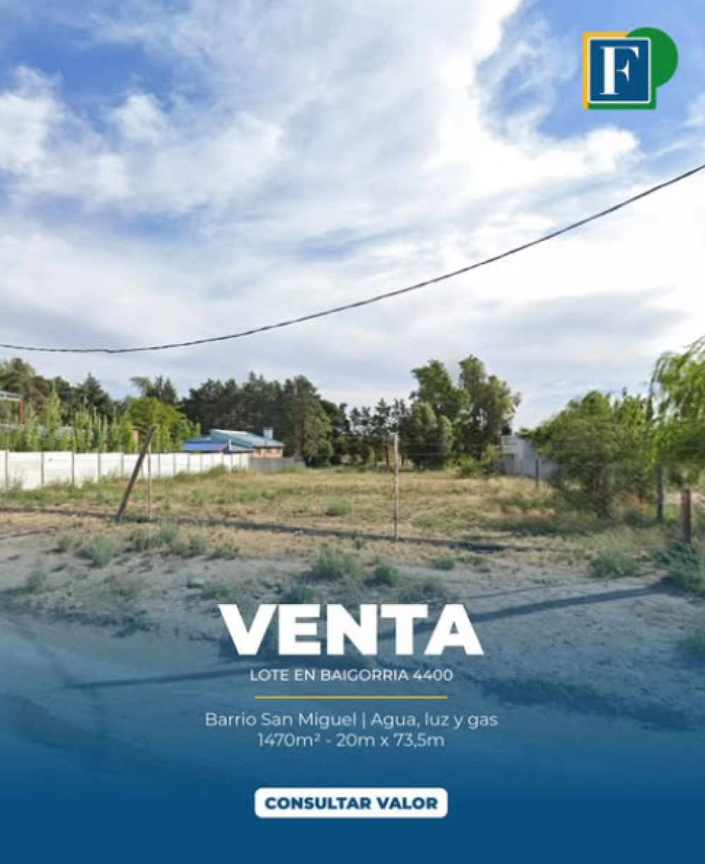 Sobre calle Baigorria altura 4400, lote de 1470 m2 (20 x 73.5 mts) con los servicios de Agua, luz y gas. Para mayor información o visitas comunicarse al: